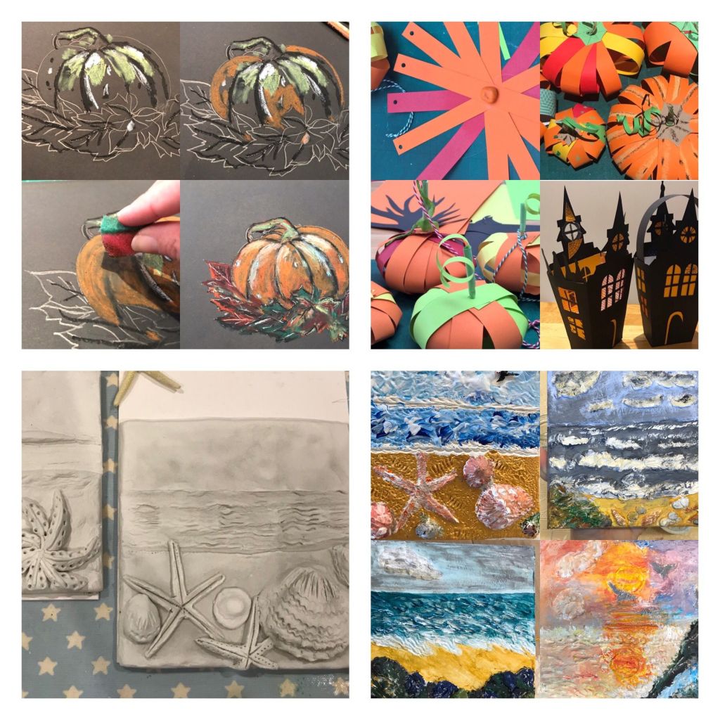 In these after school art classes for children aged 5-12, we focused on drawing and painting skills alongside more experimental techniques such as clay modelling, printmaking and collage. Workshop examples (left) include: miniature theaters, halloween arts and crafts and clay seascapes.